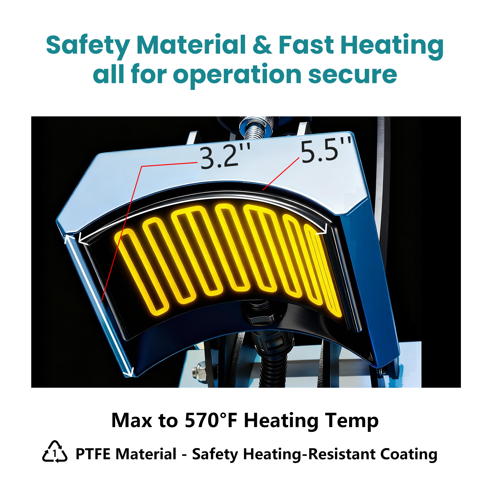Equipped with a 5.5 × 3.2-inch ceramic-coated curved heating plate, the press is shaped to fit hats and caps naturally. Even heat distribution helps prevent scorching and ensures clean, uniform transfers across curved surfaces.
