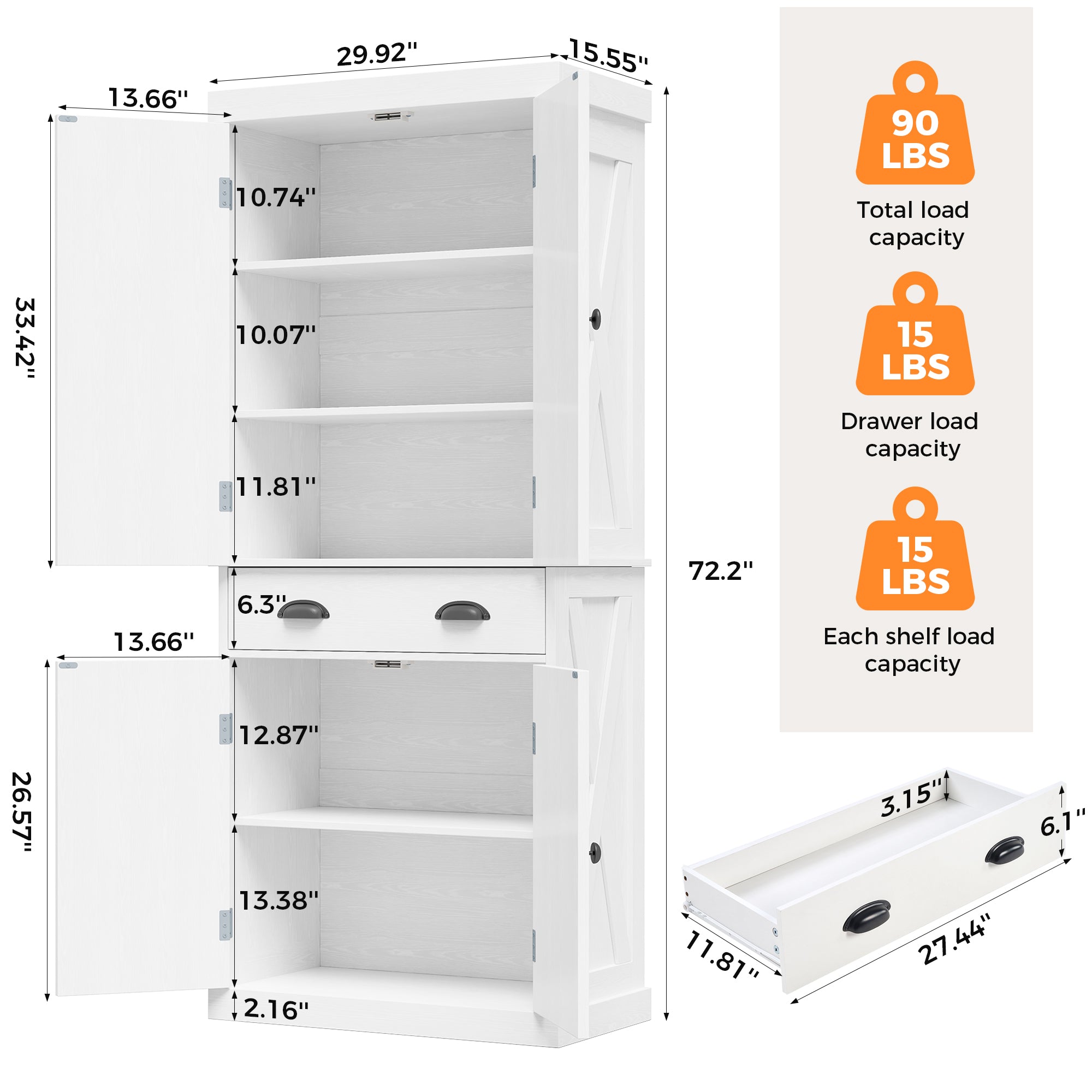 With a total weight capacity of 90 lbs, including 15 lbs per shelf and 15 lbs for the drawer, this cabinet is ideal for lightweight food items and everyday kitchen essentials, helping maintain a tidy and organized space.