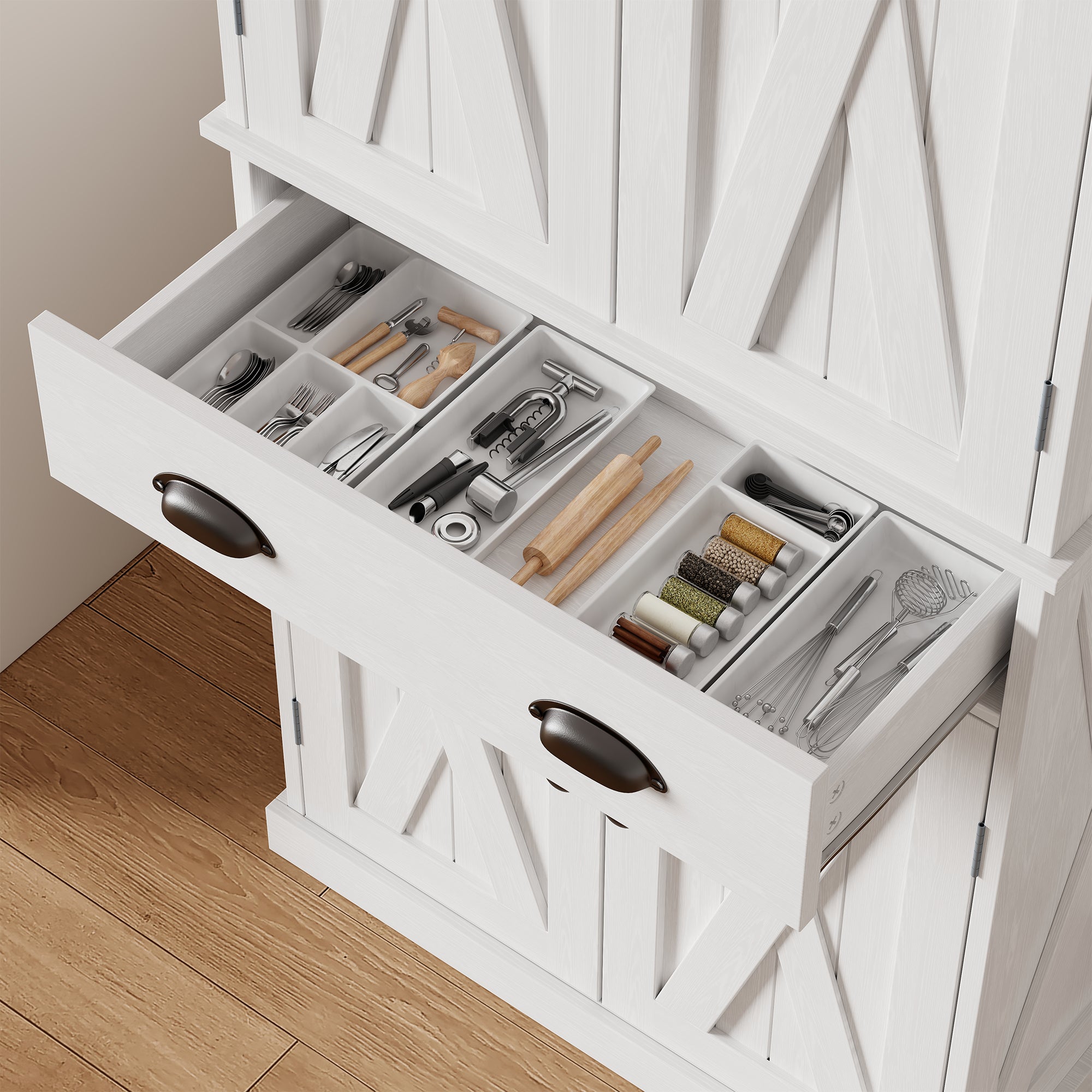 Designed for floor-standing use, this pantry cabinet includes an anti-tip device that secures it to the wall. This feature enhances stability and provides added safety for busy kitchens and family households.