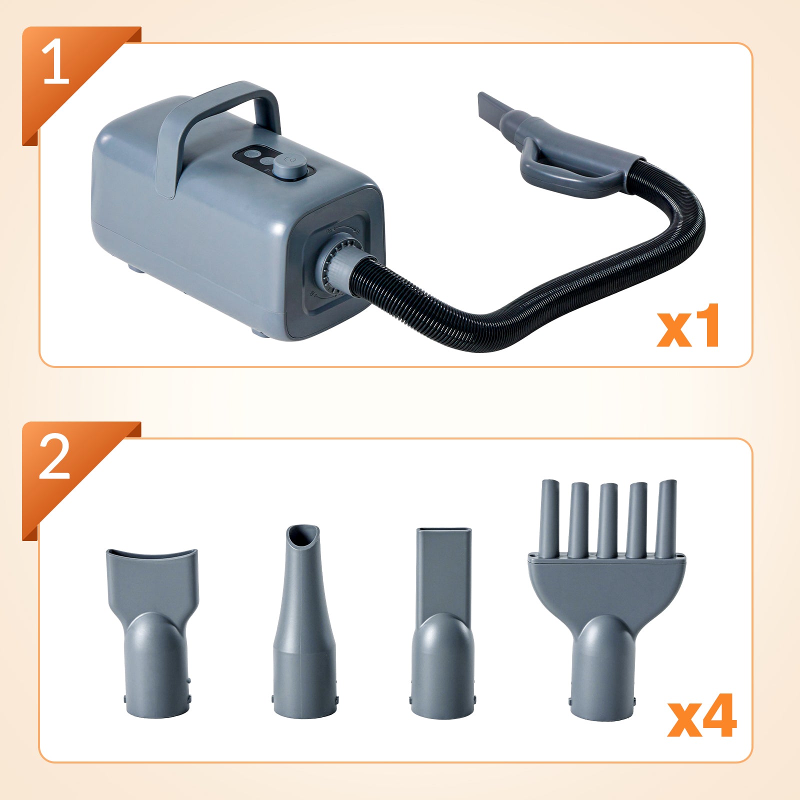 The dryer comes with four interchangeable nozzles, making it easy to customize airflow for different pets and coat types. An ergonomic, lightweight handle ensures comfortable use and easy portability, whether at home or on the go.