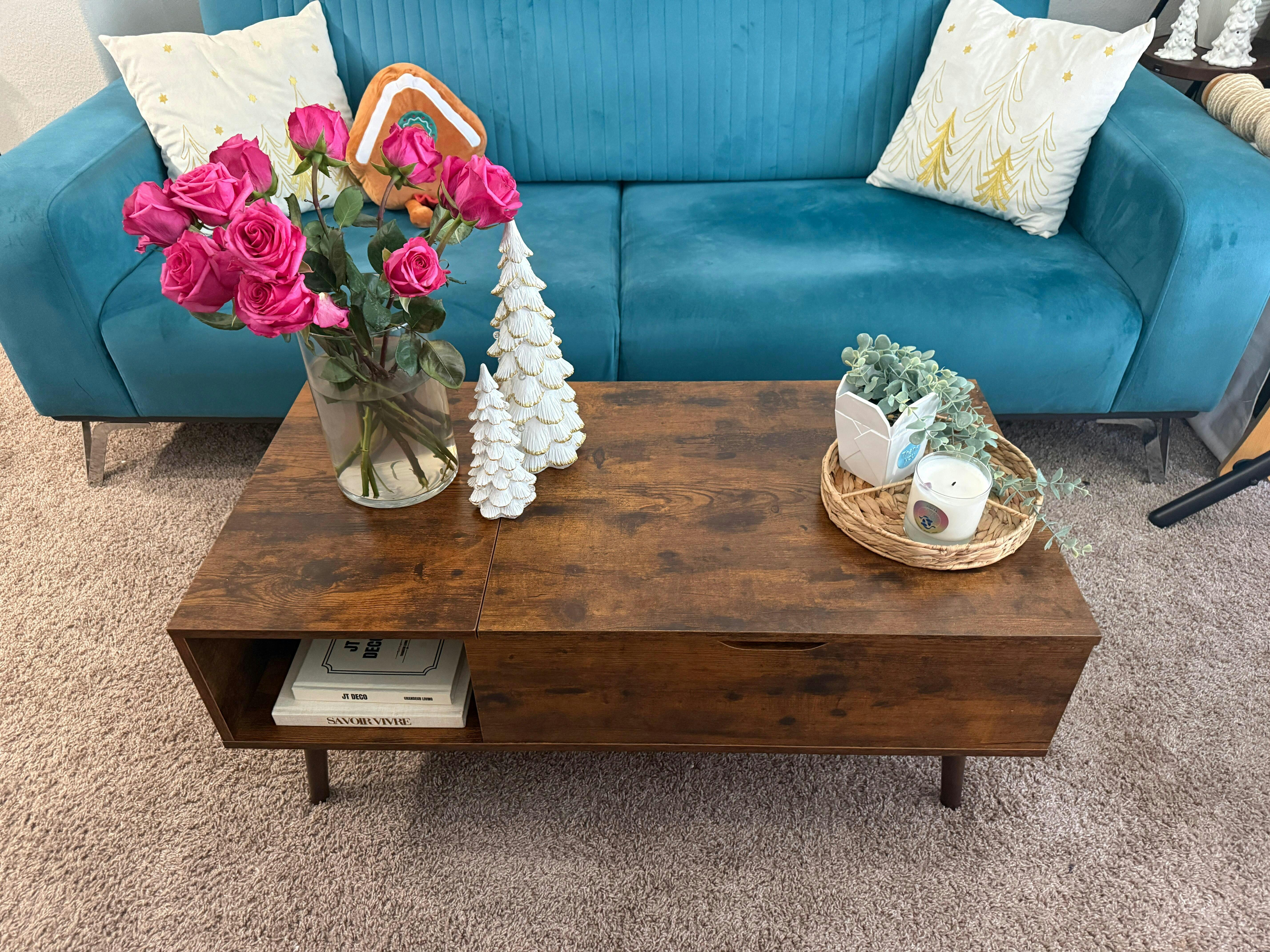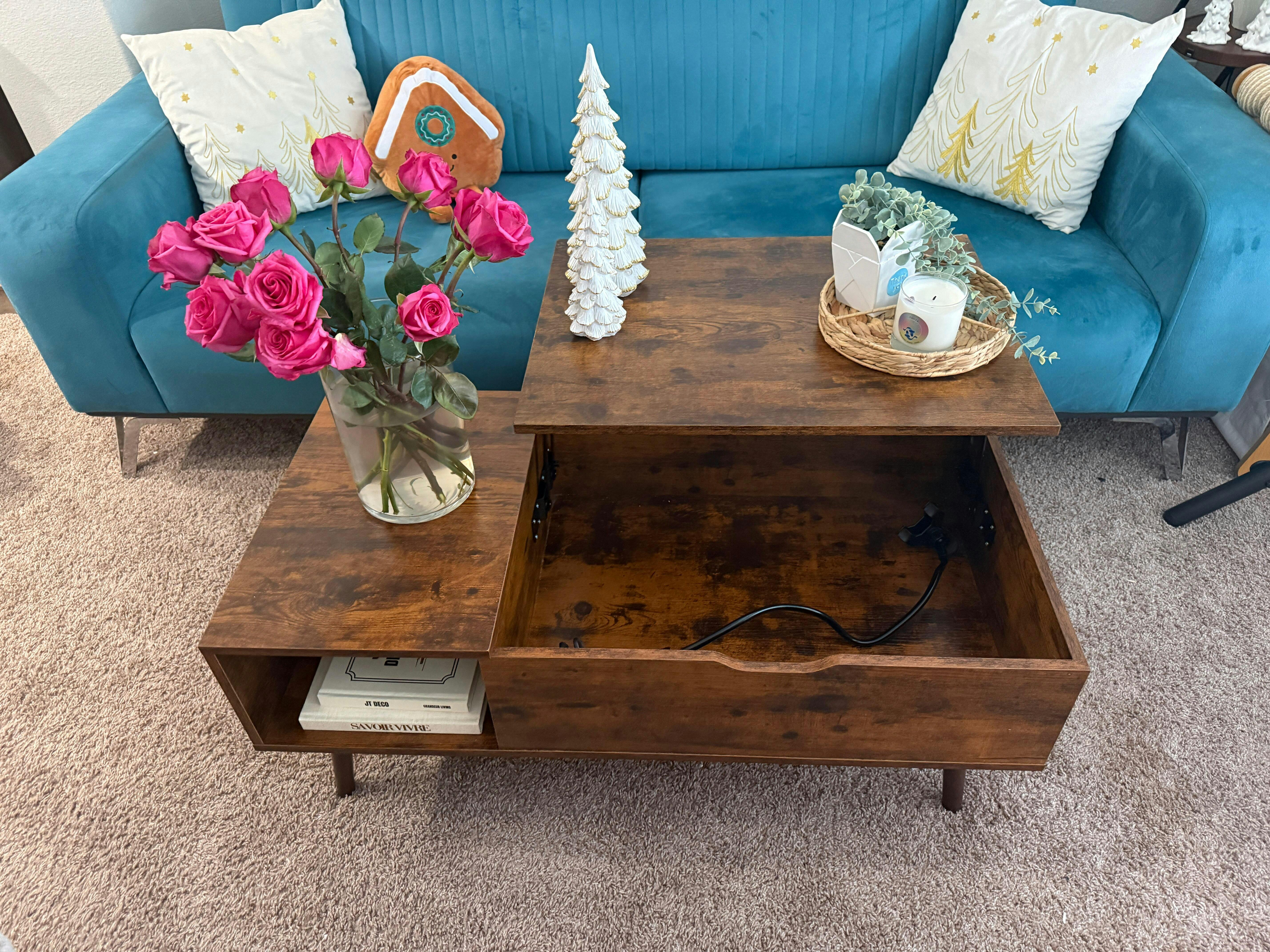 This coffee table is both stylish and functional. The lift-top makes it perfect for laptops and meals, while the hidden storage and extra shelves keep your space organized. It adds a special vibe to any room.