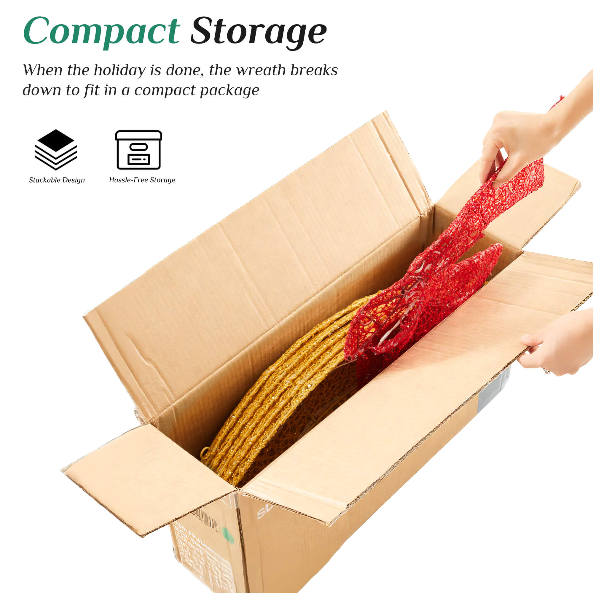 Your magnificent holiday display is just 30 minutes away. The wreath arrives in 6 pre-lit sections that connect easily with zip ties. After the season, simply disassemble for compact, flat storage, making it a reusable centerpiece of your holiday traditions.