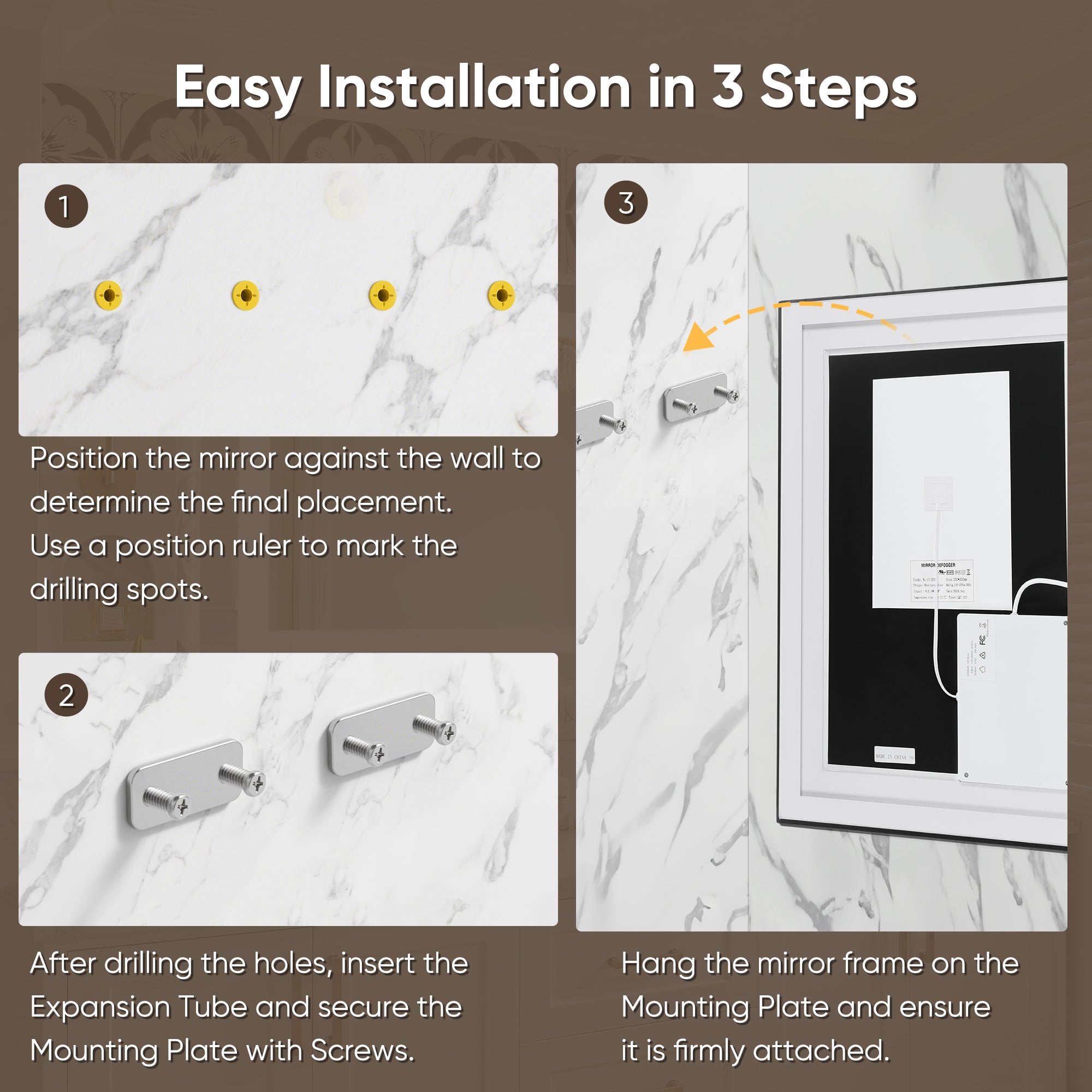 Installation is simple using the included mounting brackets, with support for both vertical and horizontal wall mounting. The mirror can be powered via a standard plug or hardwired connection, with professional installation recommended for hardwiring. A reinforced five-layer protective packaging system has been tested through repeated drop and impact tests to ensure the mirror arrives safely and in perfect condition.