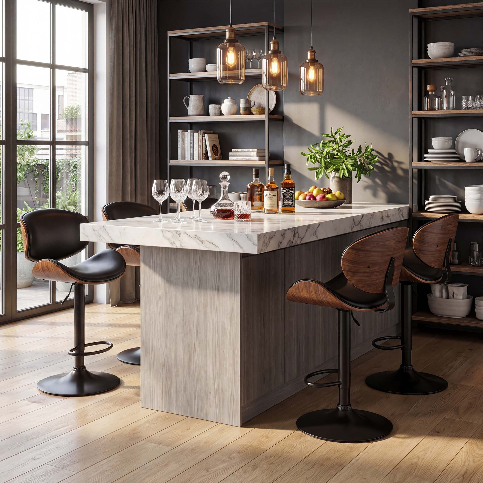 Blending smooth PU leather with warm wood accents, this bar stool delivers a modern look with lasting appeal. The gently curved seat and backrest are thoughtfully shaped to follow the body’s natural lines, offering both visual elegance and ergonomic comfort. A classic design that fits effortlessly into contemporary and transitional spaces.