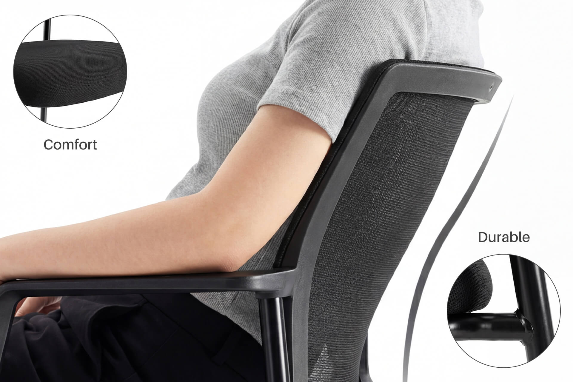 Designed with a contoured, breathable mesh back and an 18.8-inch deep seat for proper support. The high-density fabric cushion retains its shape and resilience, ensuring comfort through long meetings or events.