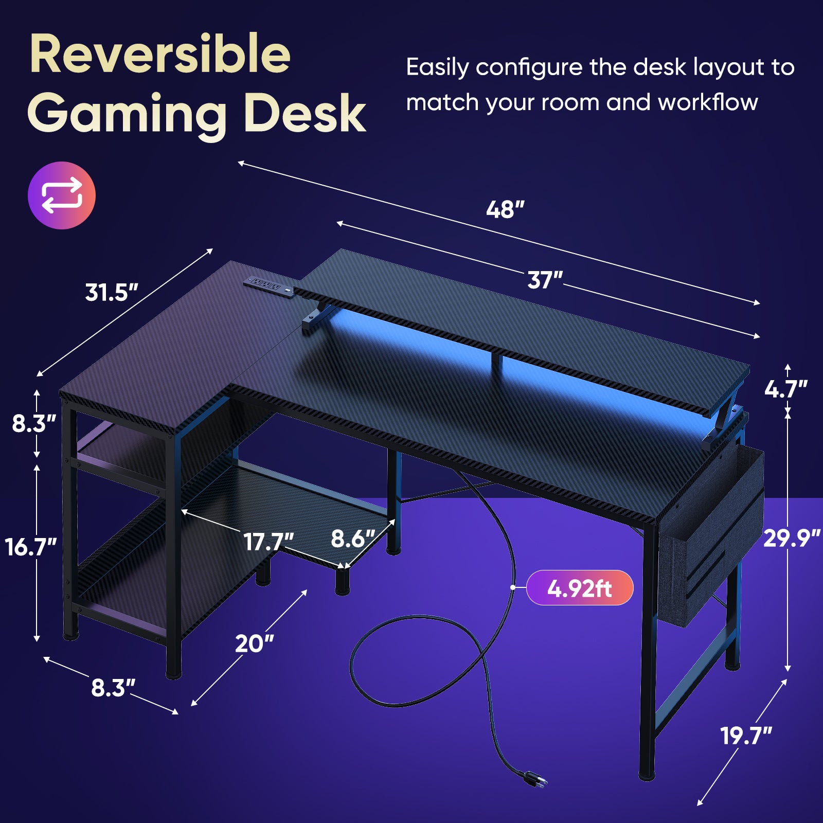 • Sweetcrispy L-Shaped Gaming Desk with Monitor Stand, LED Lights & Power Outlets