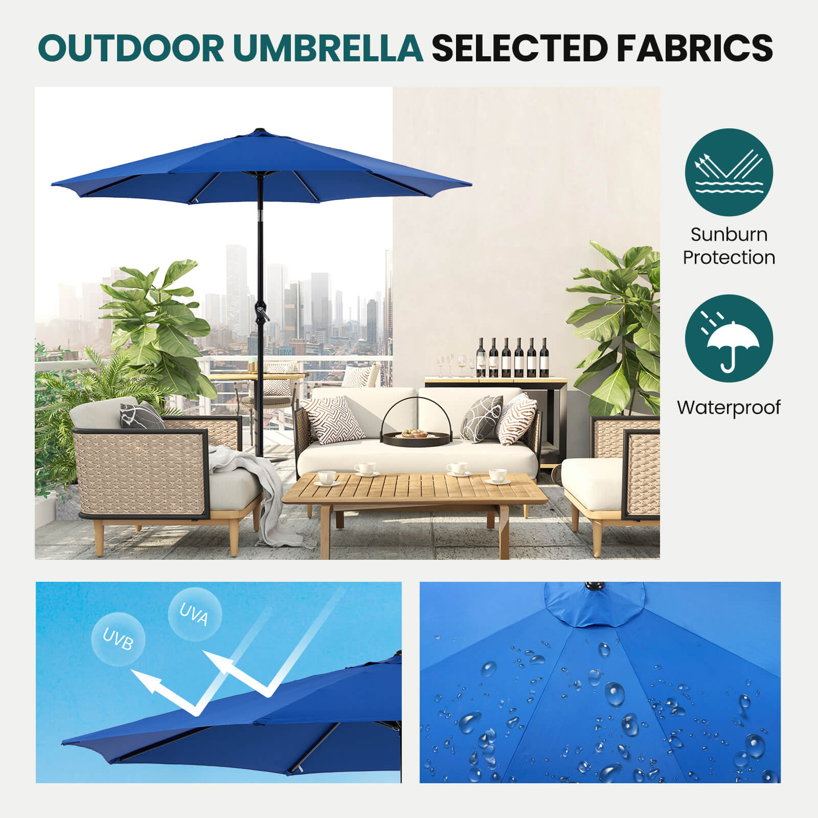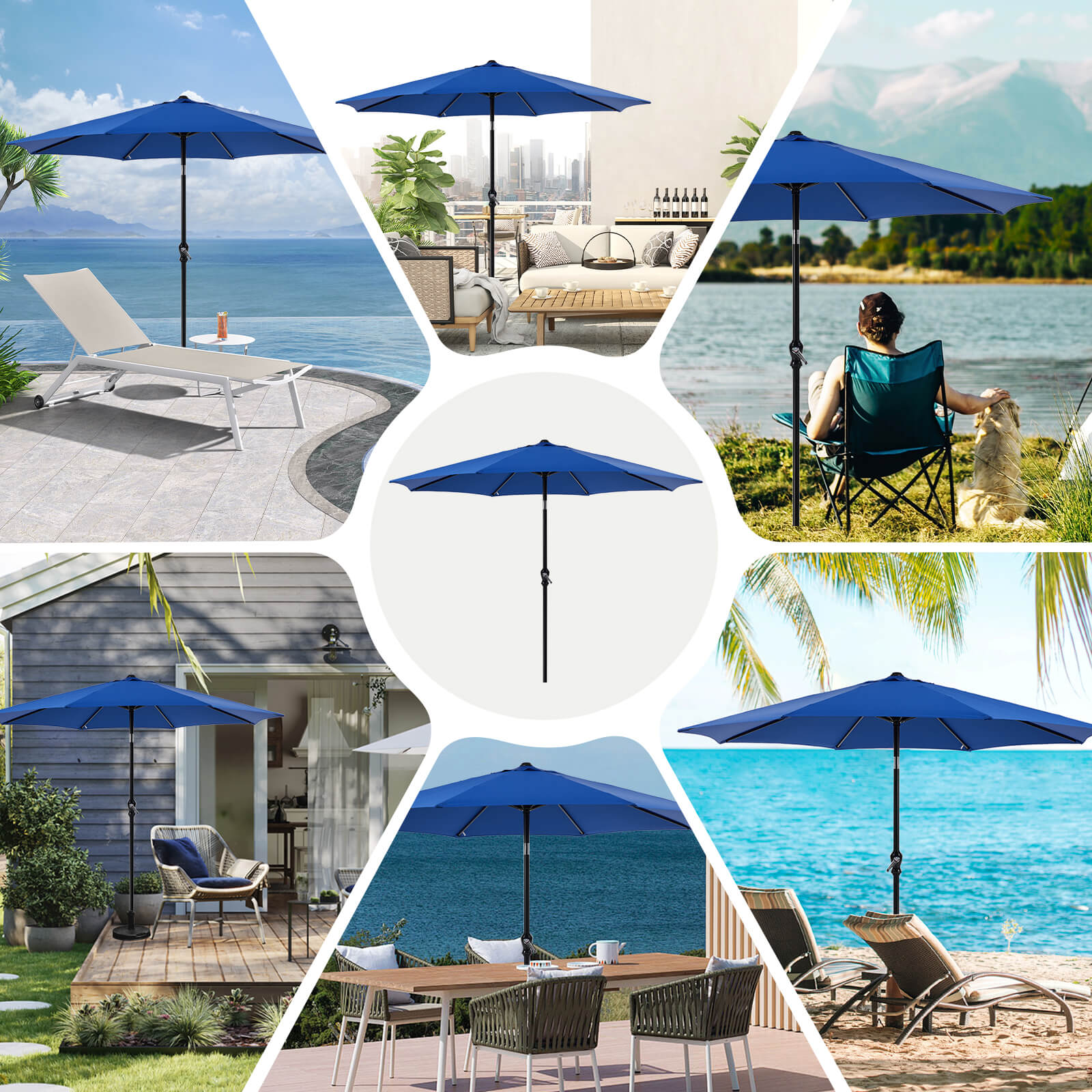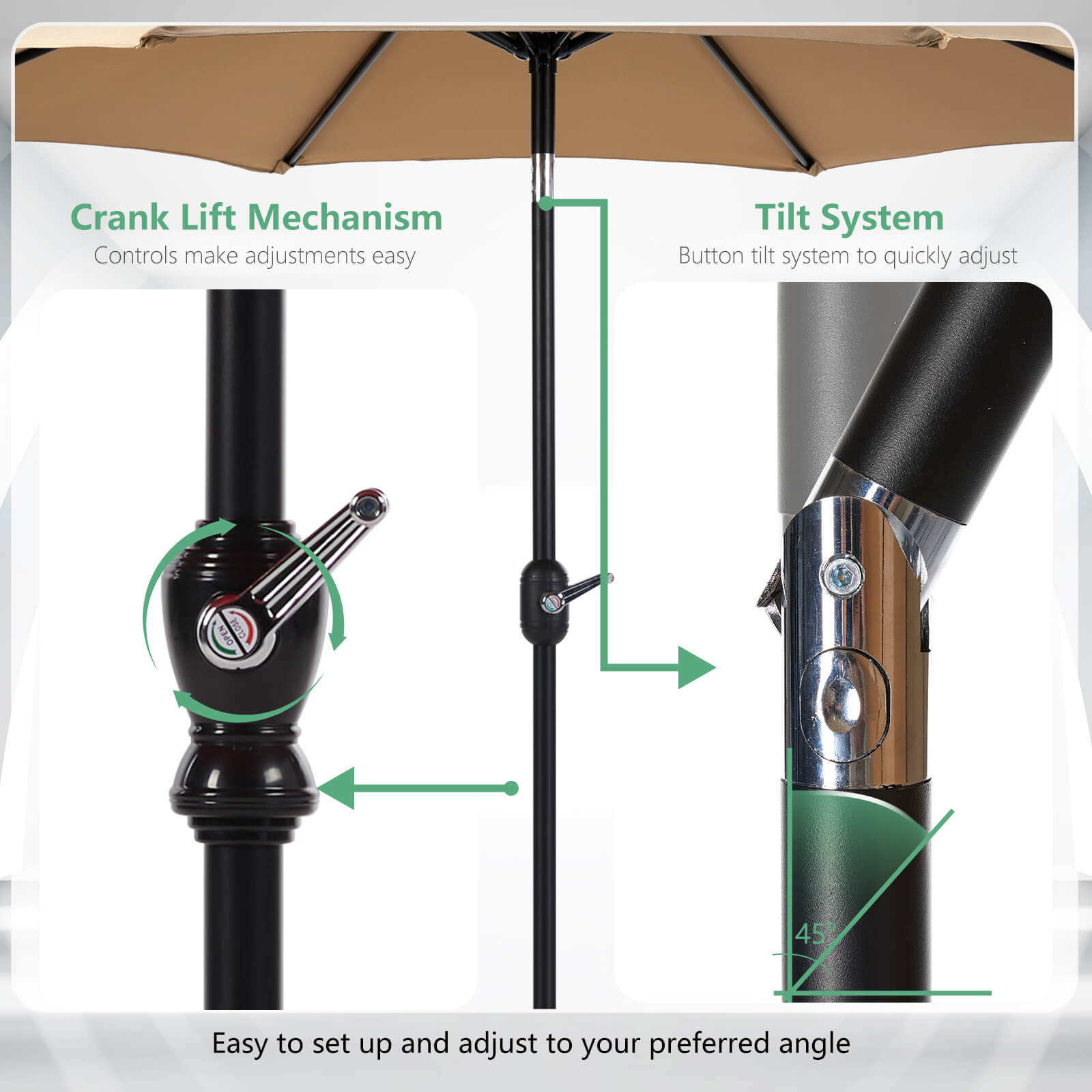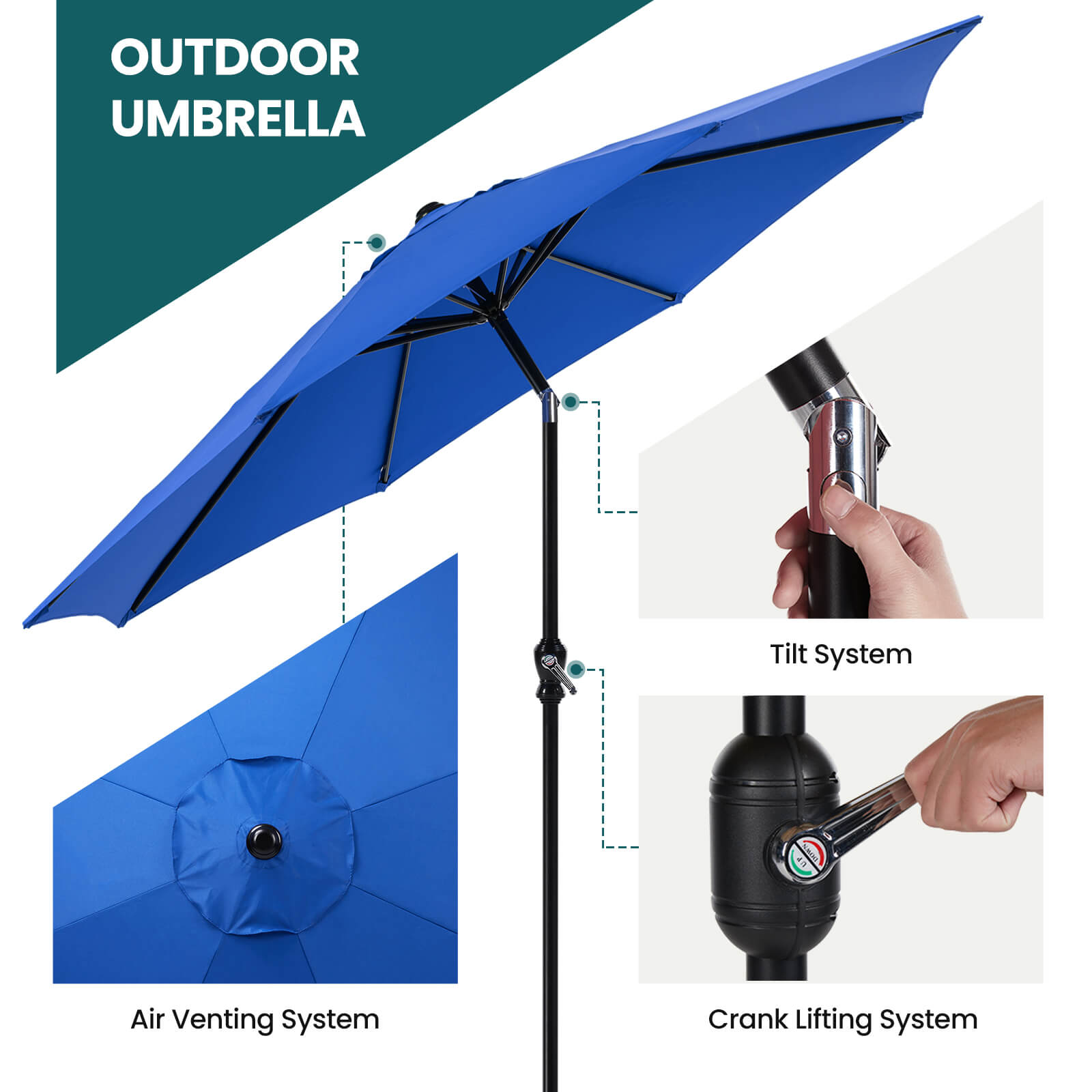 Easy to Adjust: Featuring a convenient tilt system and crank lift mechanism, this patio umbrella allows quick setup and easy angle adjustment. The user-friendly design makes it perfect for beach outings, picnics, and other outdoor activities.