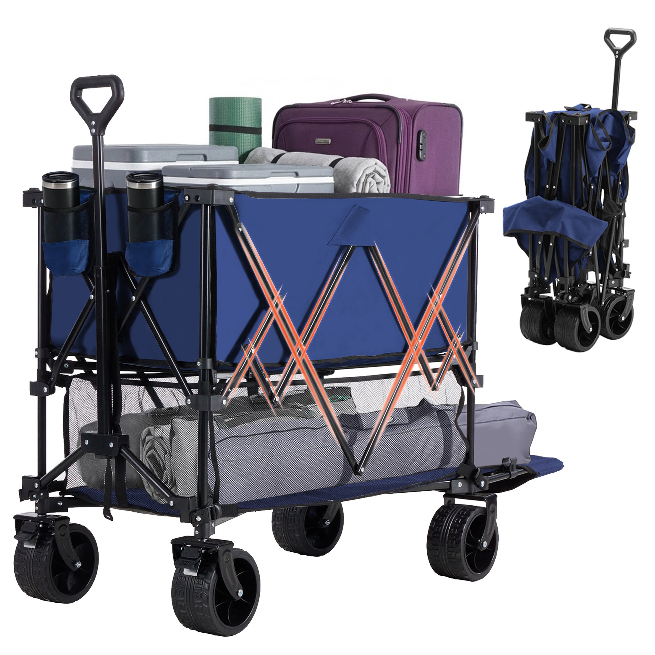 Two built-in cup holders keep drinks upright. The padded handle ensures comfortable pulling, and the included storage bag keeps everything neat when folded.
