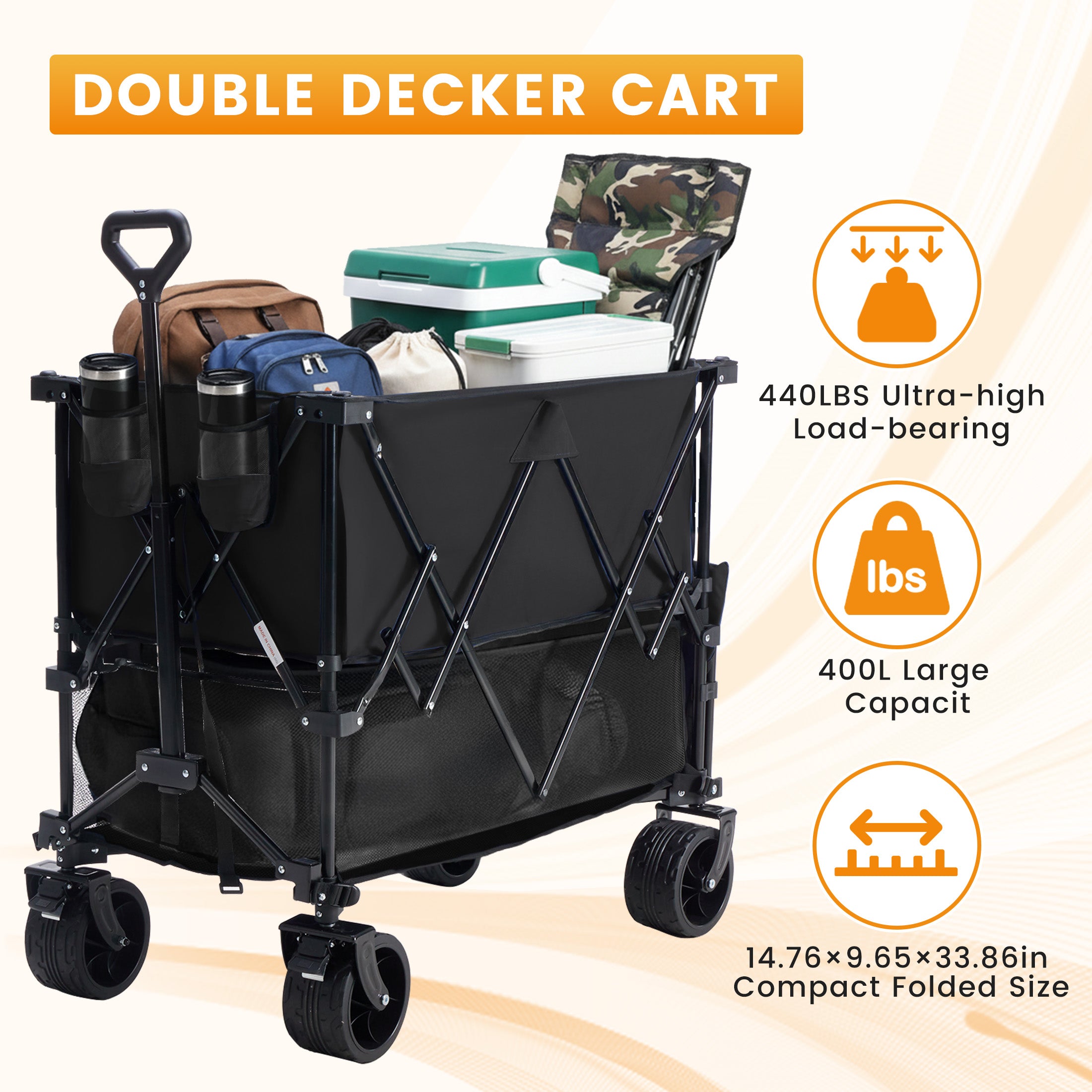 Meet the HaulMaster Double-Decker Wagon — engineered to tame your biggest hauling tasks. With a massive 400-liter capacity and a staggering 440-pound load limit, it effortlessly carries gear, groceries, or gear. When the job is done, it folds flat in seconds. Your ultimate partner for adventures and chores.