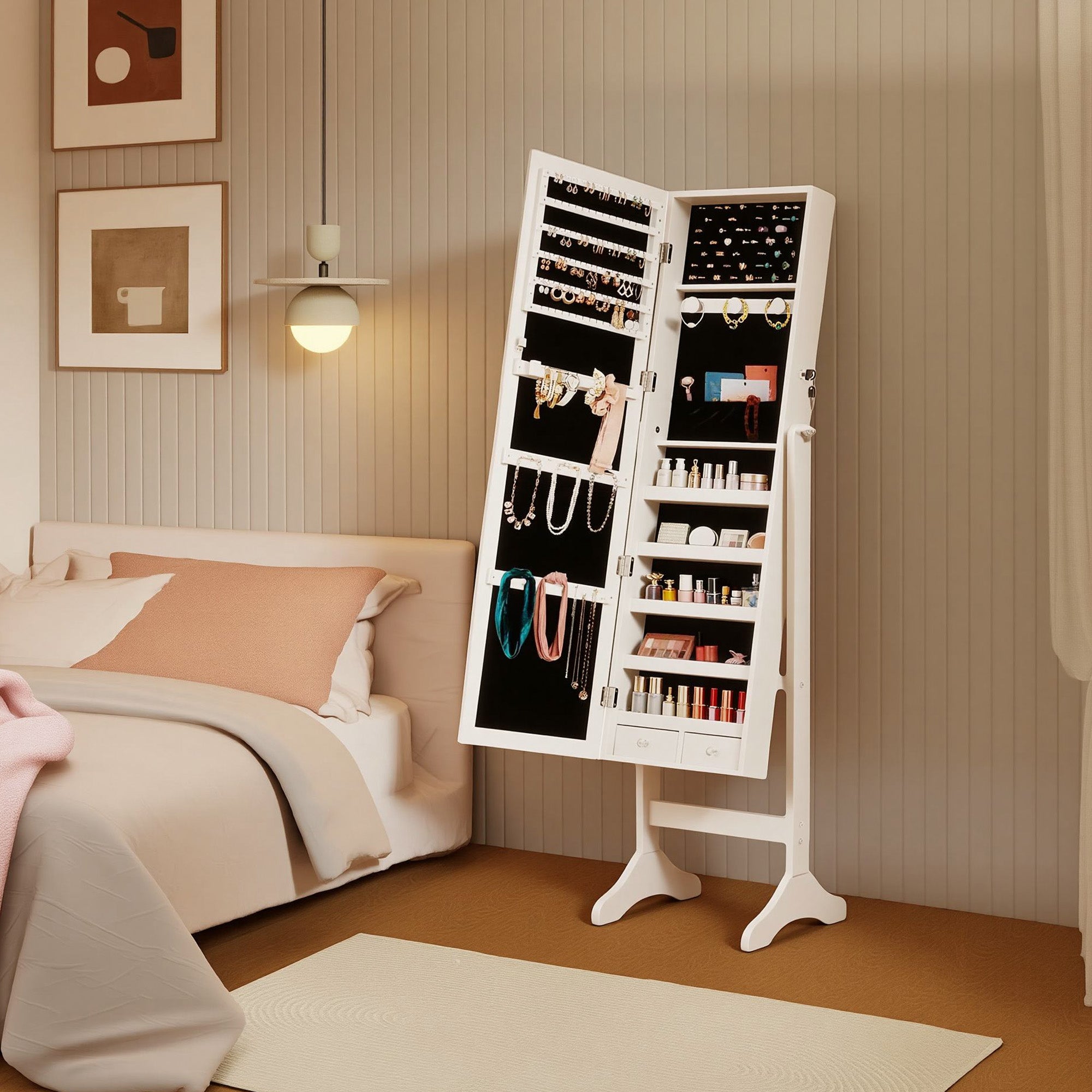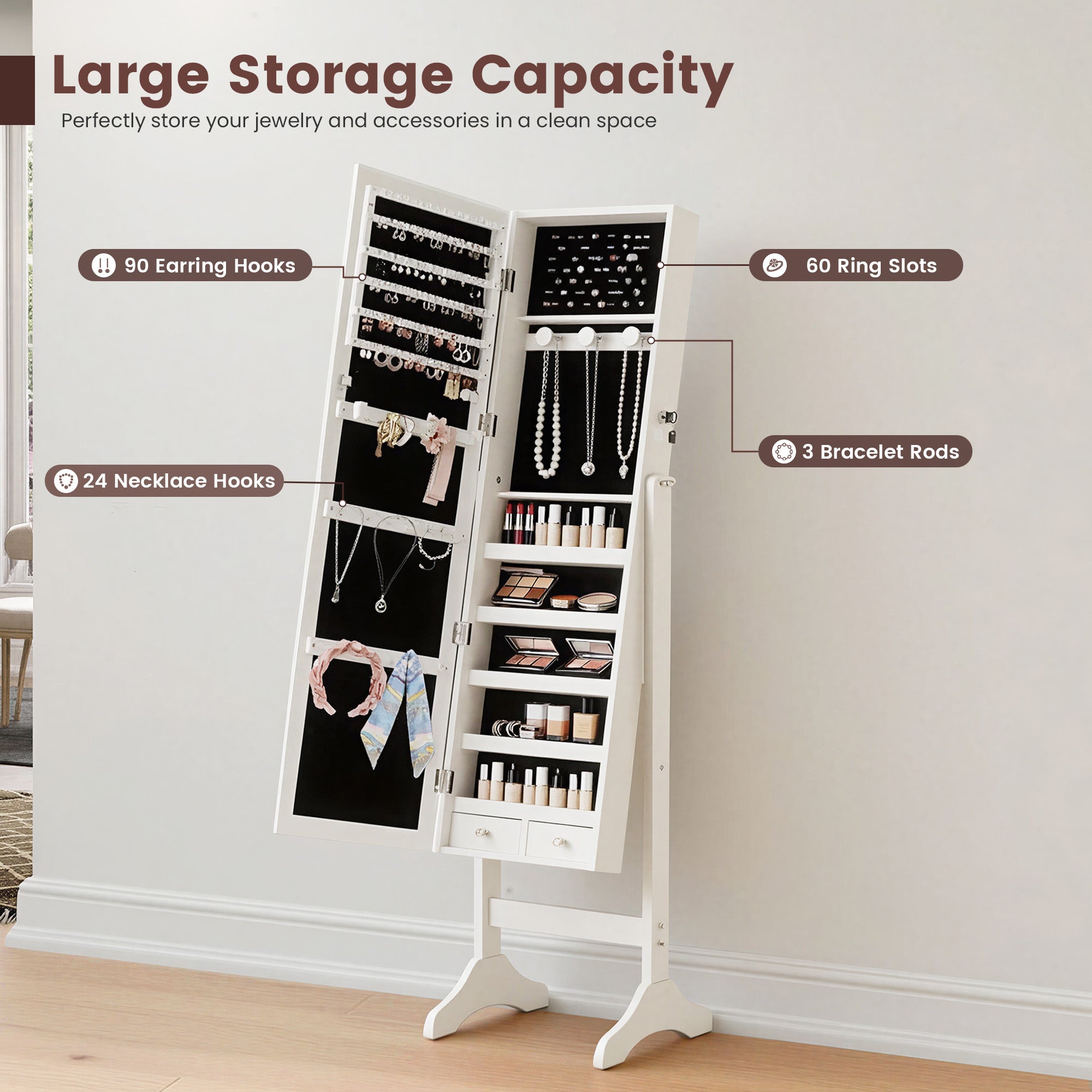 A thoughtfully designed interior keeps all your jewelry neatly organized. It includes space for up to 90 pairs of earrings, 24 necklaces, 60 rings, and 3 bracelet hooks, along with multiple shelves and small drawers for cosmetics and accessories. Everything stays visible, accessible, and tangle-free.