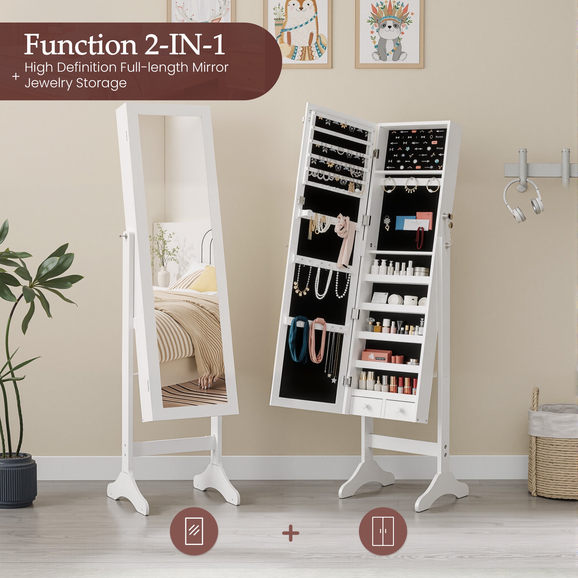 Combining a full-length mirror with a jewelry storage cabinet, this all-in-one design saves floor space while maximizing storage. It can be placed freely wherever you need it, without taking up unnecessary room.